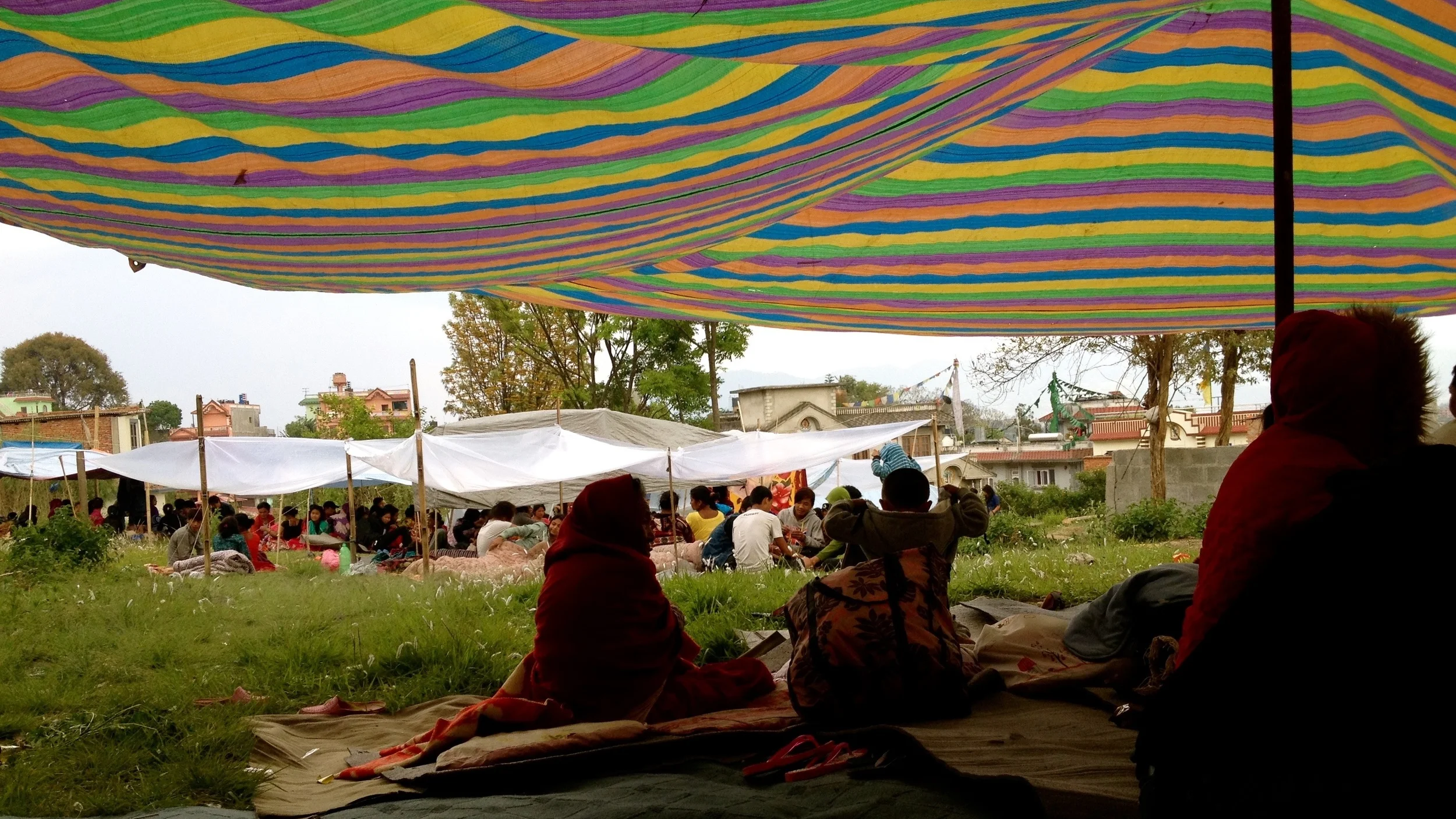 That night approximately 50 of us from the neighborhood slept outside on the grassy ground under tarps to shield us from the unfortunate rain that wouldn’t stop falling. Smaller groups formed among those families who were close friends, and these groups would come together to collectively make tea, rice and a bit of dahl over a small fire to get everyone through the night. Those with extra hot water or rice would share with those who hadn’t any; those with extra blankets would lay them over whoever looked the coldest. A radio was placed in the center of everyone, blaring crackled news and frantic updates in Nepali. I can’t remember if it was placed in the center of the group or if people circled around it... It was left on constantly, until the battery died. In the evenings the young adults/late teenagers would sit around under the tarp playing small wooden instruments and signing traditional Nepali songs, and within 10 minutes nearly everyone had joined in, smiling and singing as one, despite the heavy rain seeping into our bed for the night. This collective caretaking and space sharing continued on for 5 days.