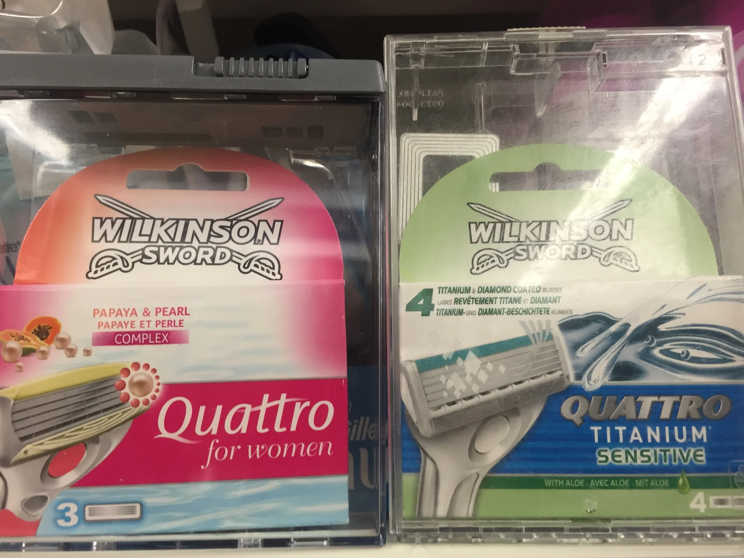 Take the photo below: we have the same brand of razor, one targeted towards men and the other to women, and the font of the razor name, Quattro, is actually changed to appear more “feminine”.