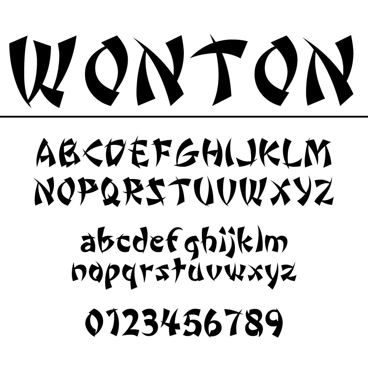 However, more commonly seen are ethnic fonts like Wonton shown here. It is an example of one of the many “Asian” fonts available that are “characterized by curved and pointed wedge strokes that superficially resemble two of the eight basic strokes of Chinese calligraphy […]. Unfortunately, the strokes, forced onto the armature of Roman letters, are assembled in a manner that completely ignores a calligraphic emphasis on structural balance and harmony.”[6] However, as Shaw points out, not all ethnic fonts are based in any real representation of culture. Some fonts just become ethnic by association, and that label becomes inescapable.